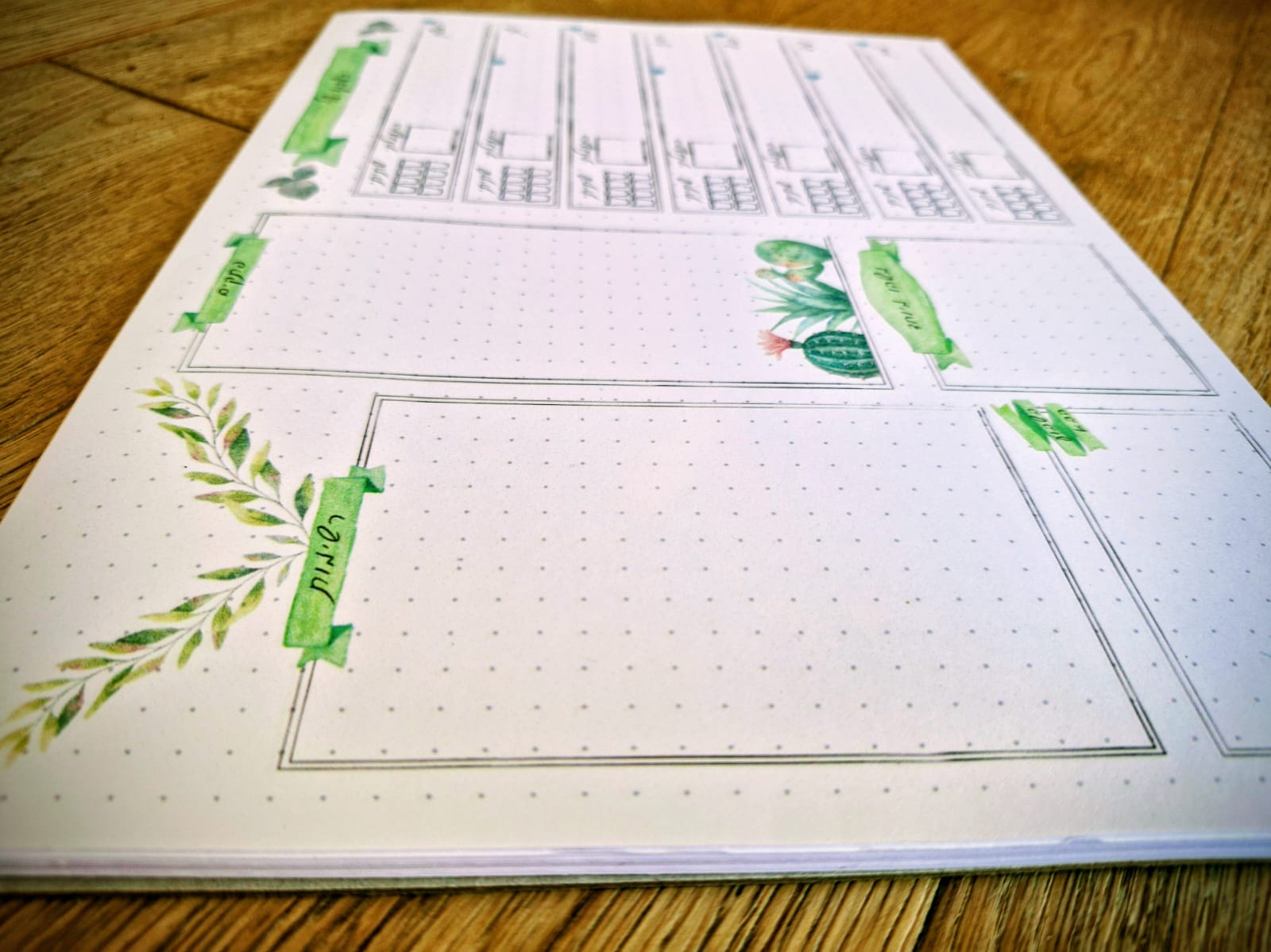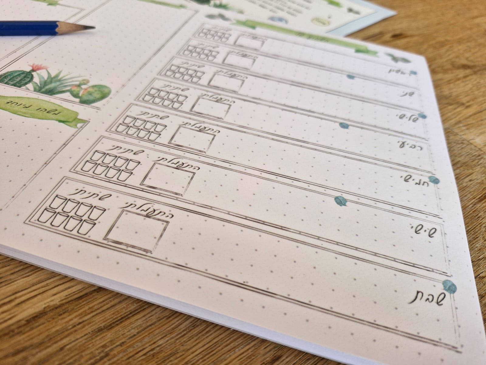 ללוח עיצוב קקטוסים באיור צבעי מים, משלב מקום נוח ומסוגנן לכתיבת רשימות, דברים מיוחדים ופתקים מדליקים.